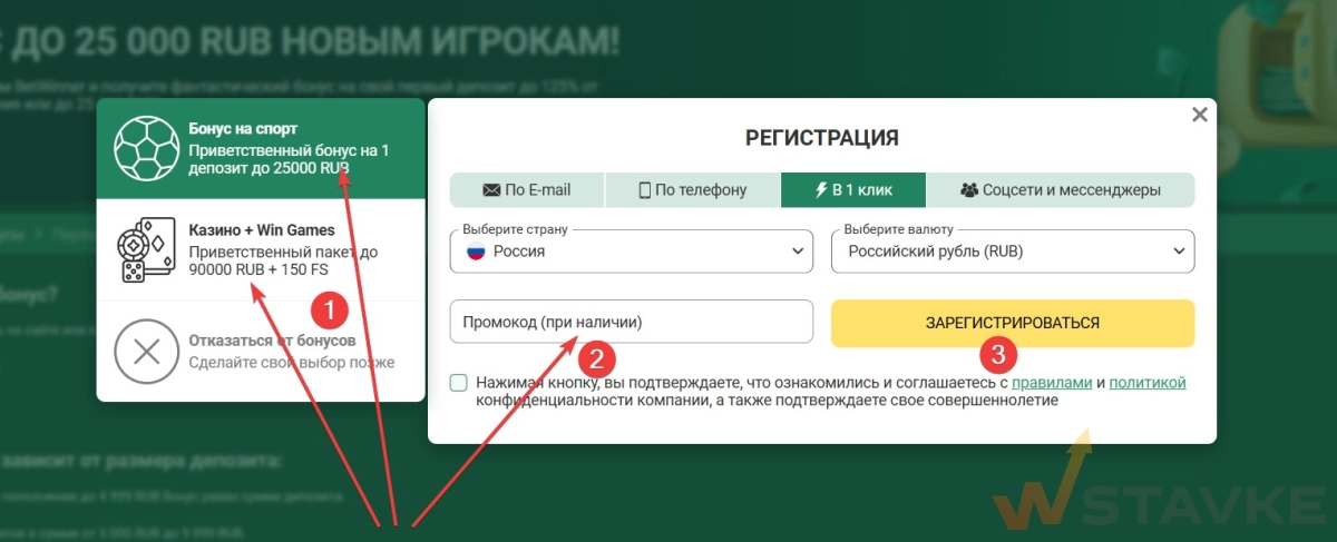 Сначала нужно зарегистрироваться — на сайте или через мобильное приложение, разницы нет. В форме регистрации будет поле для промокода, туда вводите BETW25000 если хотите ставить на спорт, или WBETFREE для казино.
