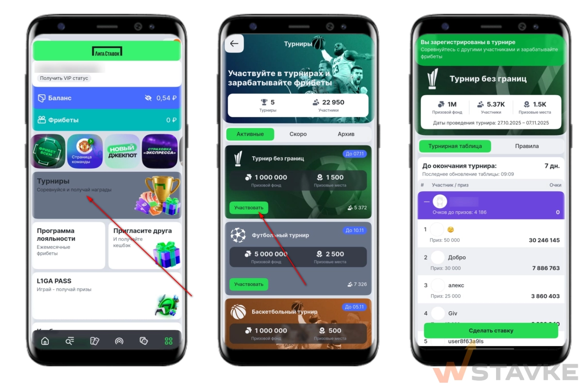 В мобильном приложении зайдите в раздел «Турниры» и нажмите «Участвовать» в каждом. Это обязательно — иначе ставки не засчитаются.