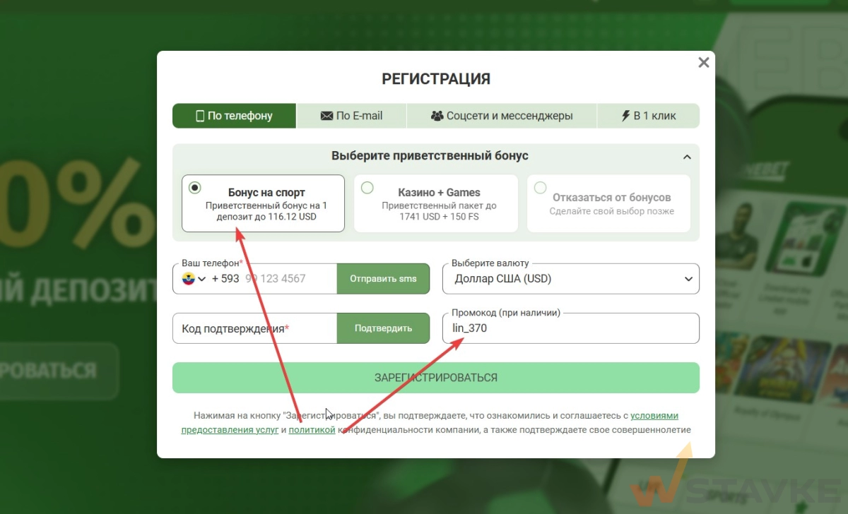 Переходите на сайт → проходите регистрацию в Лайнбет → вводите промокод Linebet → забирайте до 145 USD на бонусный счёт!