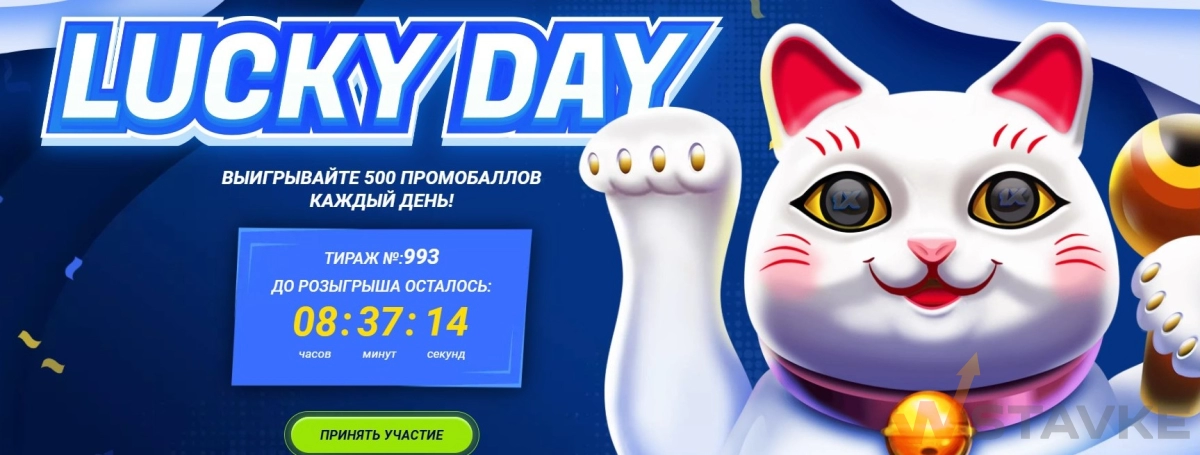 Акция «Счастливчик дня» — способ получать дополнительные бонусы без изменения привычной стратегии ставок. Призовой фонд 50 000 промобаллов разыгрывается ежедневно между 100 участниками. Главное — не забывать подтверждать участие каждое воскресенье и делать ставки от 157 рублей с коэффициентом 1.8 до 20:00 UTC+3.