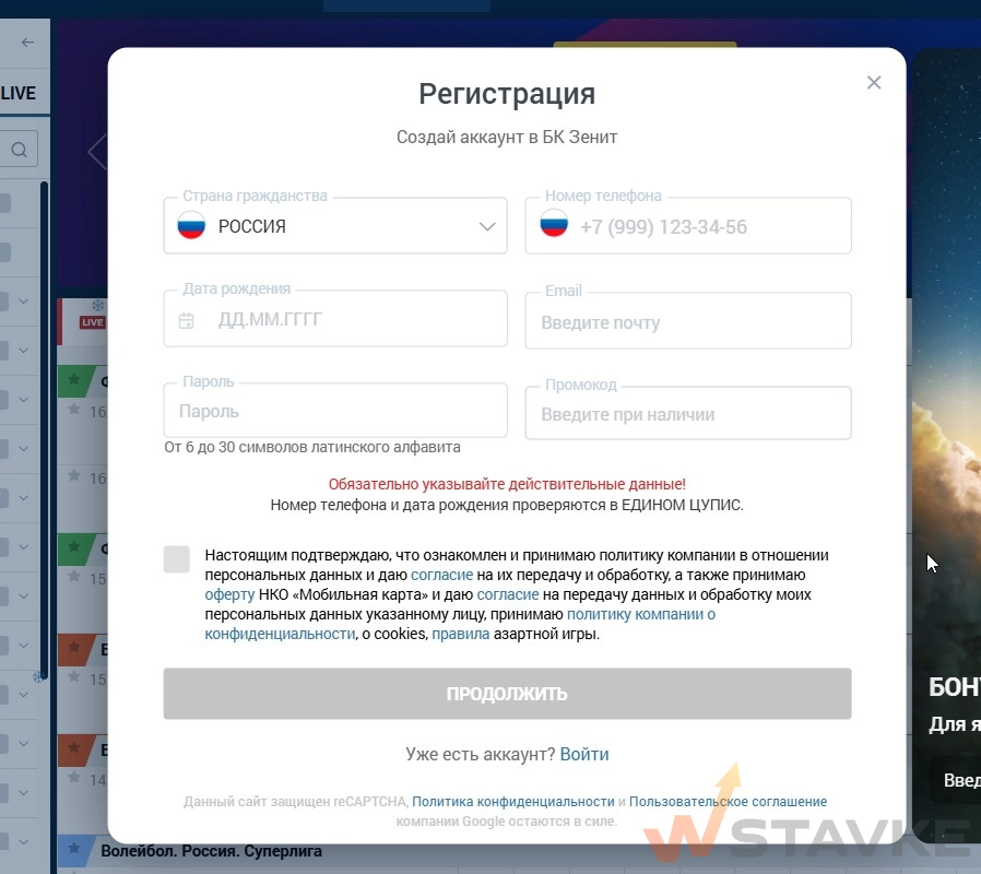 Форма регистрации в Зените простая и занимает пару минут. Подробная инструкция по регистрации в БК Зенит есть в отдельной статье, здесь — краткий алгоритм.